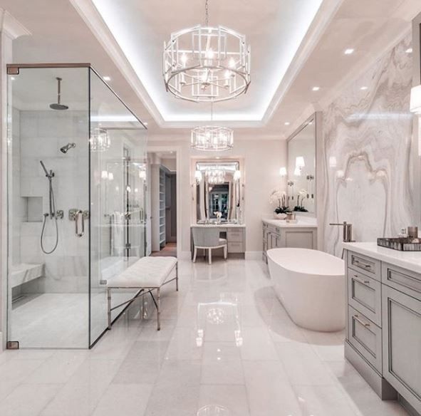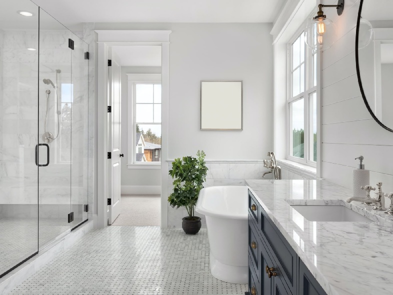 Select Materials: Pick tiles, grout, waterproofing, countertops, and finishes (e.g., chrome, matte black).